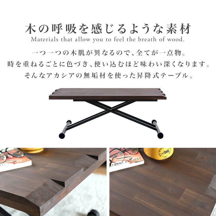 昇降テーブル 昇降式テーブル リフティングテーブル リフトテーブル 120cm幅 高さ25-72cm おしゃれ 北欧 アンティーク調 木製 天然木 アカシア無垢 キャスター脚 高さ無段階調整 テレワーク 在宅勤務 リモートワーク レセ リフトテーブル