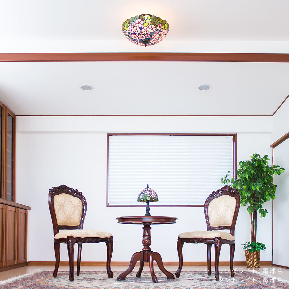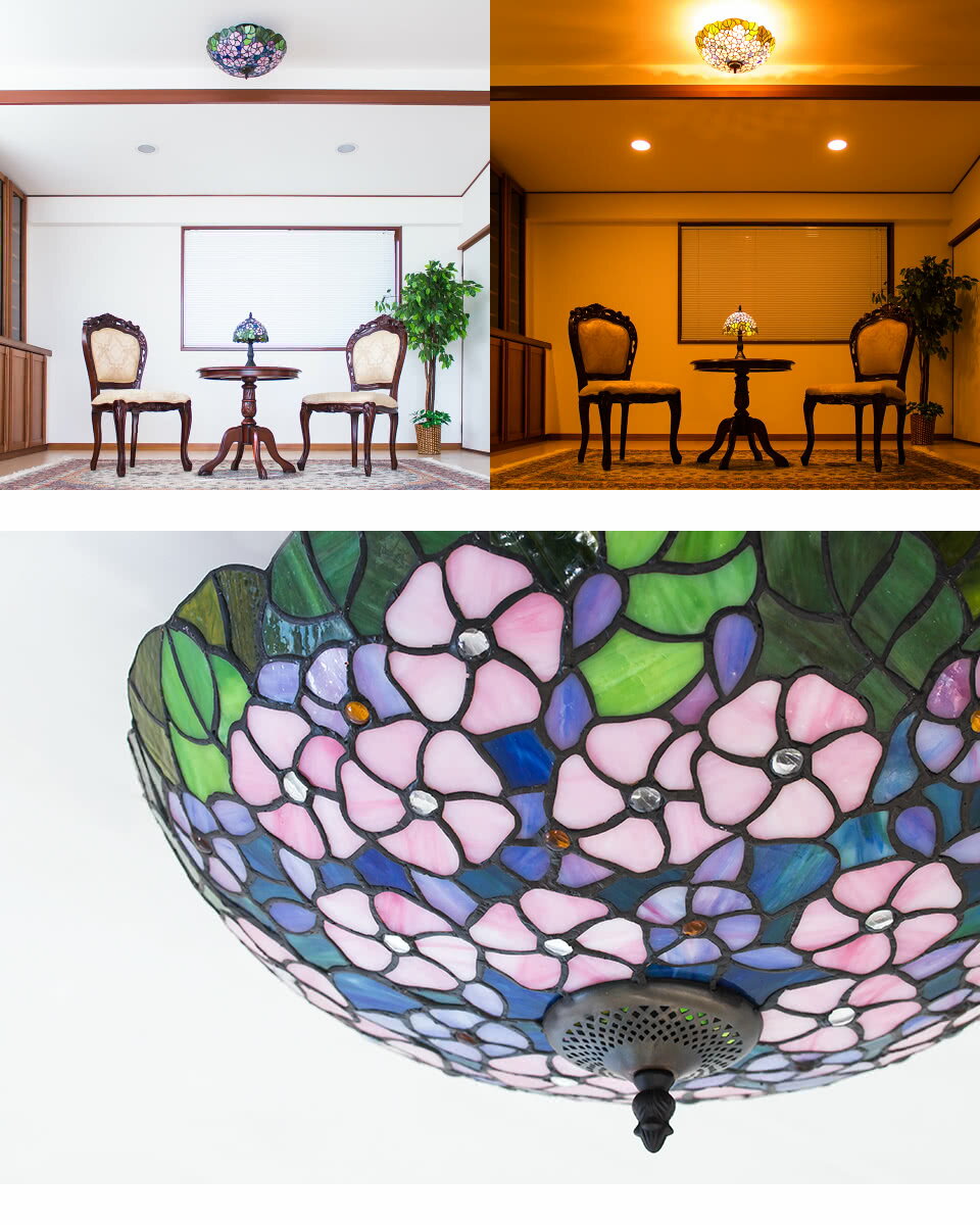 【今だけプレゼント、LED電球を無料でセット】ステンドグラス 照明 シーリングライト 天井照明 ランプシェード 6畳 天井直付灯 リビング 居間 ベッドルーム 寝室 フラワー 18インチ 4灯 アンティーク ライト お花 クラシック おしゃれ かわいい ヴィトライユ フルーリー