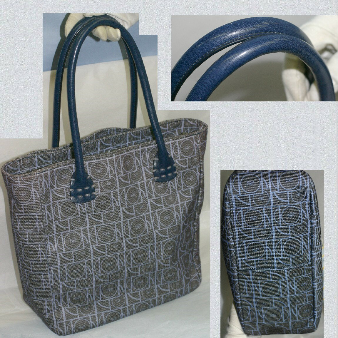 サイズは上横34下横27x28x13cmで丈夫な濃紺の革の持ち手の長さ48cm位で附属品はございません。